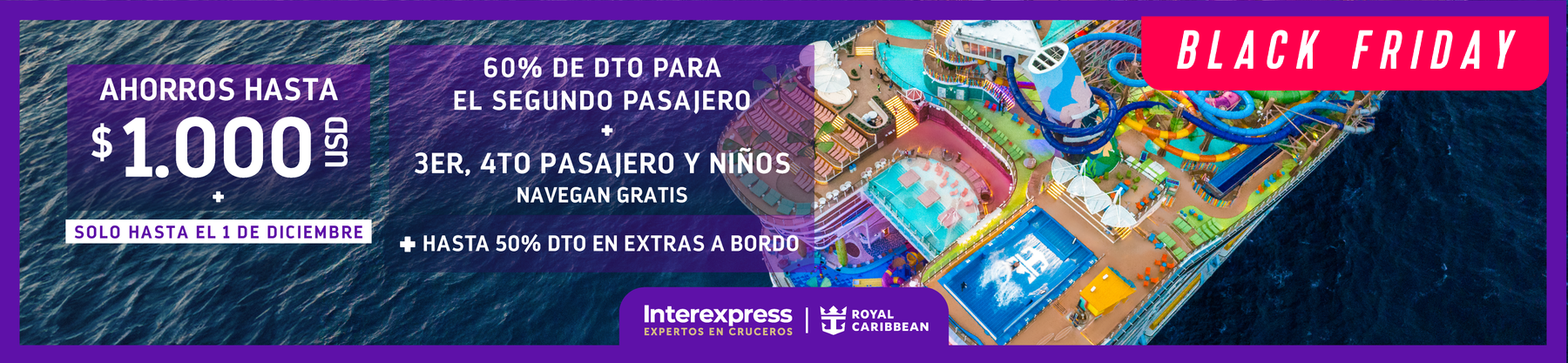 Promoción: Hasta $1.000 de ahorros + 3er y 4to pasajero gratis* + 60% dscto segundo pasajero + Niños gratis* + hasta 50% descuento en extras a bordo (Gráfica adjunta)