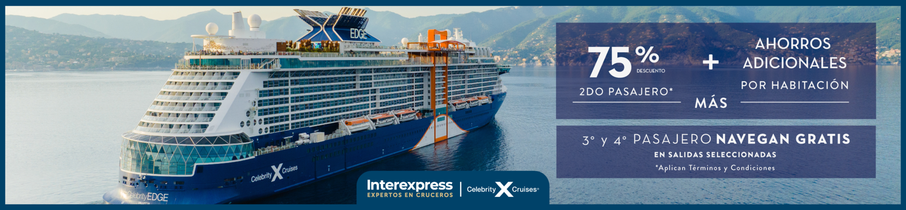 Condiciones generales: Las promociones no aplican en Galápagos y Alaska Cruise Tours. Los cambios en la reserva pueden dar lugar a la eliminación de la oferta. Los precios y ofertas están sujetos a disponibilidad y cambios sin previo aviso, capacidad controlada y pueden retirarse en cualquier momento. Celebrity Cruises se reserva el derecho de corregir cualquier error, inexactitud u omisión y de cambiar o actualizar tarifas, tarifas y recargos en cualquier momento sin previo aviso.