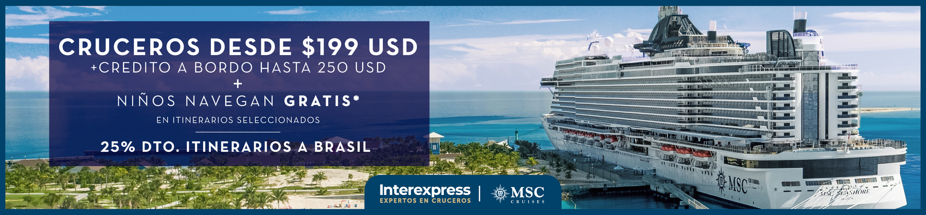 Términos y Condiciones: La oferta de niños gratis aplica en salidas seleccionadas y es para menores de 17 años que viajan como 3 y 4 pasajero. La oferta de hasta 250 USD de Crédito a Bordo es por cabina y depende de la cantidad de noches, tipo de cabina y fecha de zarpe. Condiciones generales: Promoción hasta 15 diciembre 2025 o hasta agotar stock de 5 cabinas por salida, lo que ocurra primero. Los cambios en la reserva pueden dar lugar a la eliminación de la oferta. Los precios y ofertas están sujetos a disponibilidad y cambios sin previo aviso, capacidad controlada y pueden retirarse en cualquier momento. MSC Cruises se reserva el derecho de corregir cualquier error, inexactitud u omisión y de cambiar o actualizar tarifas, tarifas y recargos en cualquier momento sin previo aviso.